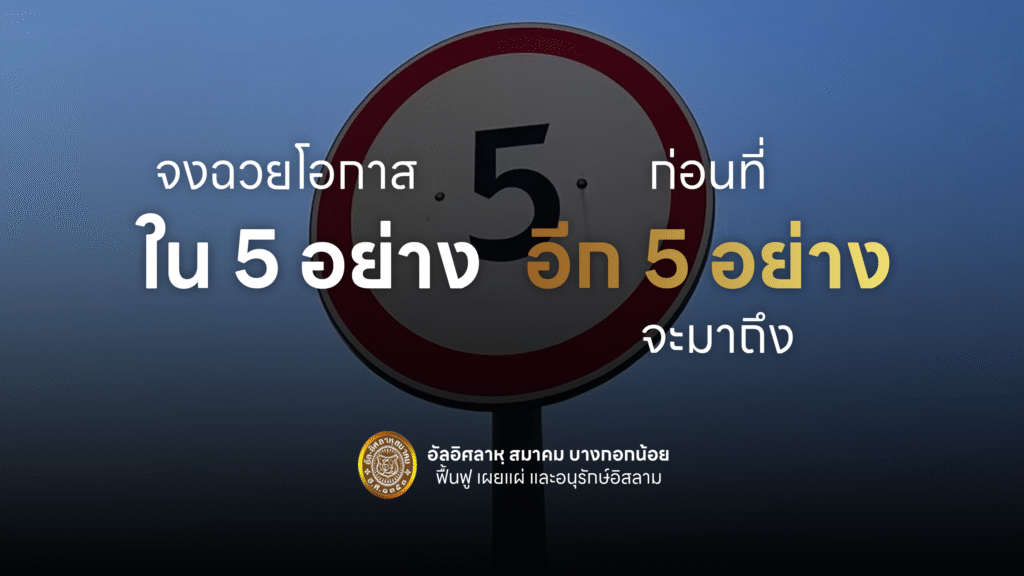 นิมิตร์ดี ๕ ประการนี้ ถ้าเราใคร่ครวญให้ดีก็จะเห็นได้ว่า เป็นโอกาสอันดีสำหรับมุสลิมมุอฺมินที่จะรีบฉวยโอกาสค้นคว้าปฏิบัติแต่ในสิ่งที่ดีงามอันจะเป็นเสบียงติดตัวไป และเร่งมือเสริมสร้างการงาที่เป็นกุศลกรรมเพื่อที่จะได้รับการตอบแทนทั้งในโลกนี้(ดุนยา) และโลกหน้า(อาคิเราะฮฺ) อัลหะดิษบทนี้ ท่านร่อซูลลุลลอฮฺ ศ็อลลัลลอฮุอะลัยฮิวะซัลลัม แนะนำเราให้รีบฉวยโอกาสเมื่อเราประสบกับนิมิตร์ดี ๕ ประการดังกล่าว ก่อนที่นิมิตร์ร้ายจะมาถึงคือ ความชรา ความเจ็บป่วย ความยากจน ความยุ่งยากกังวลใจและความตาย